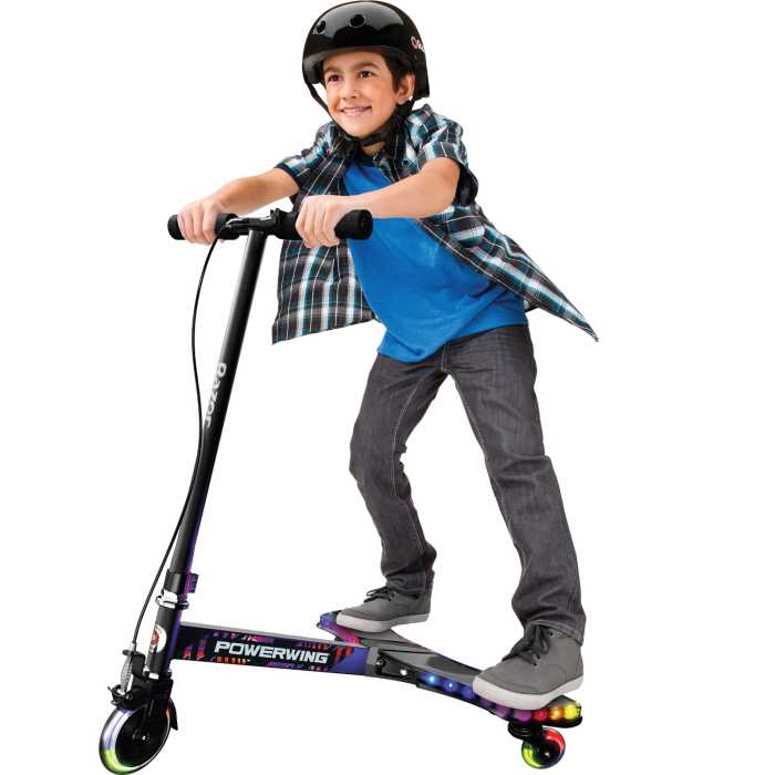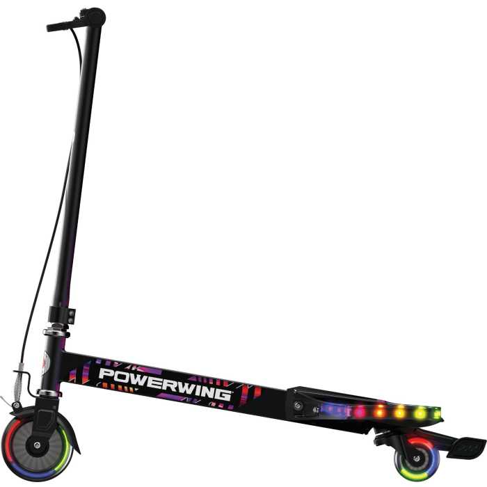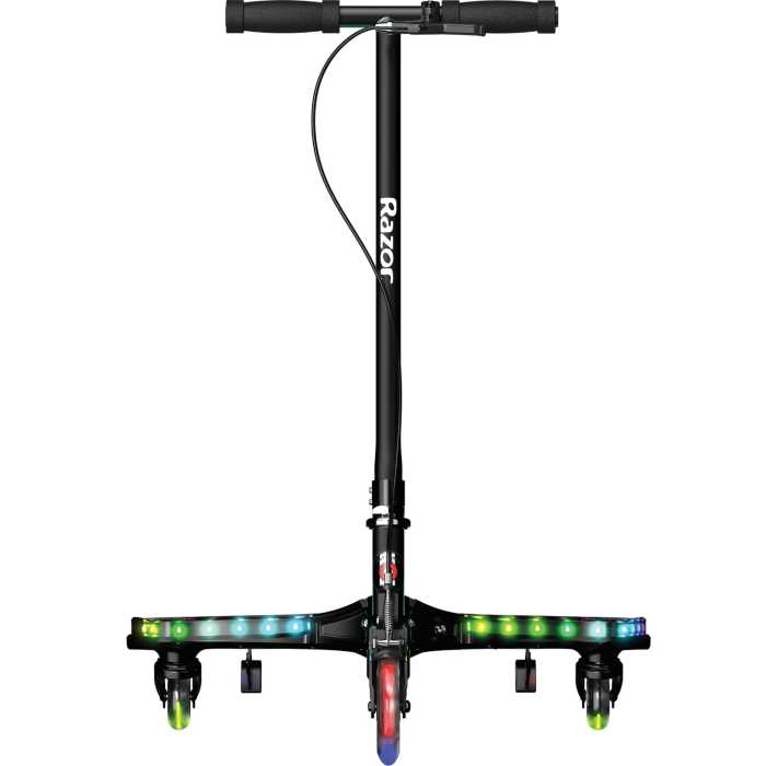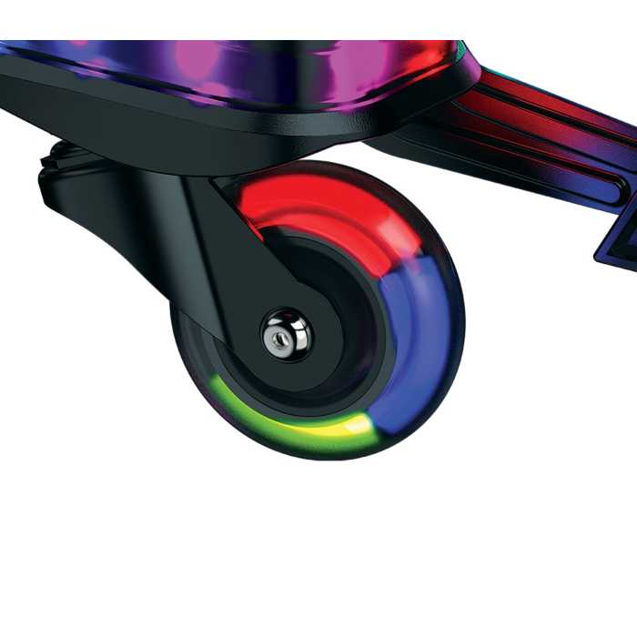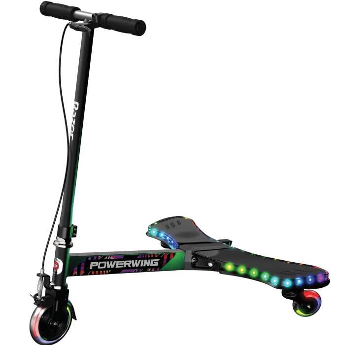 Get ready to spin and drift until the sun goes down with the unique three-wheeled Razor PowerWing Lightshow. Designed to make your kid’s childhood more memorable, this innovative caster scooter delivers unlimited side-to-side forward movement and features over 30 multi-coloured LED lights with five different light modes. The motion-activated light show shines through the translucent deck and urethane wheels to generate eye-popping colours. The hand- operated front fender brake and foam grips make stopping and control a breeze.