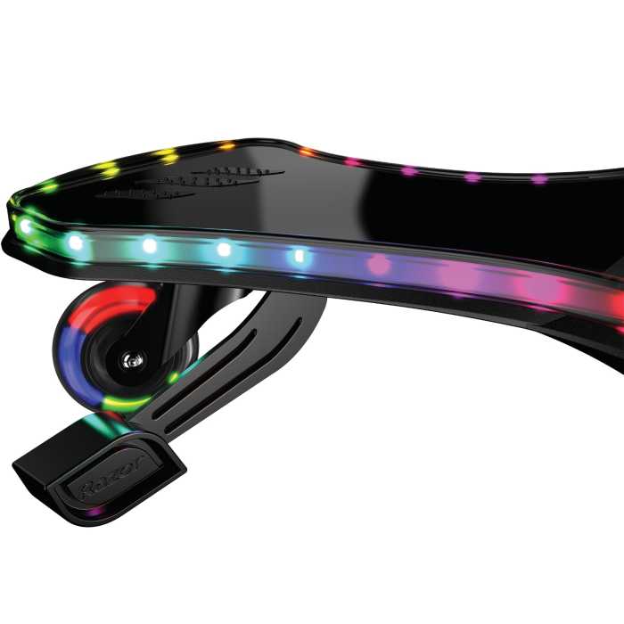 - Motion-activated light show shines through the translucent deck and urethane wheels