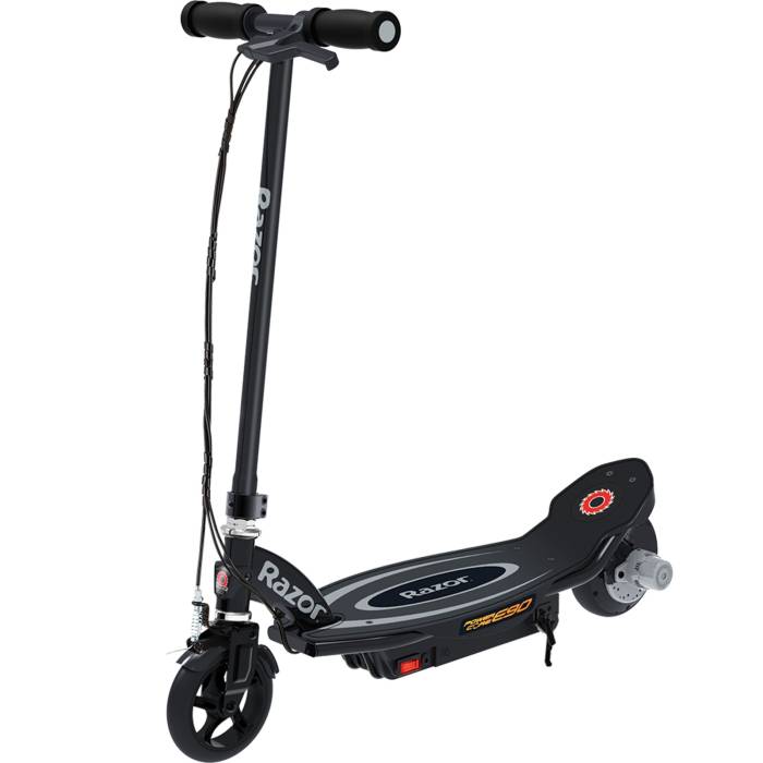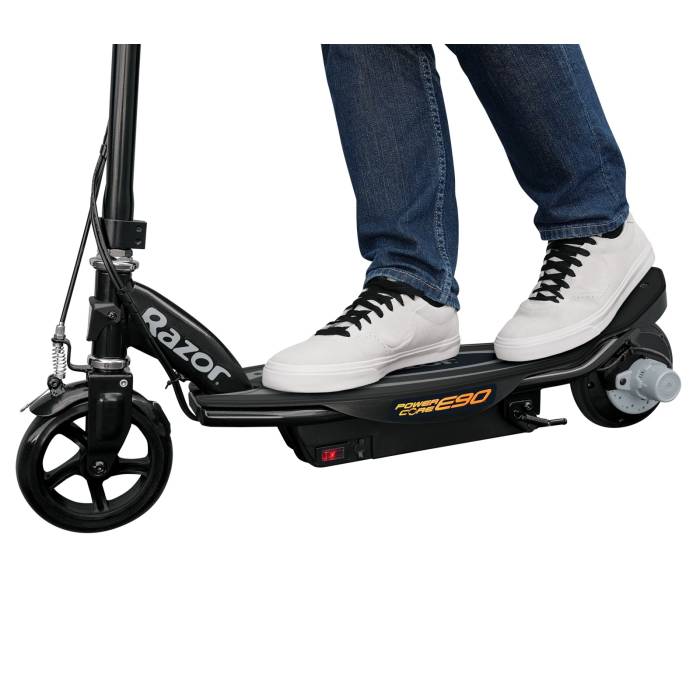 Power-up Your Ride. The Razor Power Core E90 is upping the ante for electric scooters once again, rolling out an amazing 65 minutes of continuous ride time and fifty percent more muscle power. Its innovative hub motor delivers a more efficient, maintenance-free ride (no alignment, no chain, no belt), while the steel frame, lighter weight and increased torque take performance to the next level. With a max speed of up to 10 mph. It has a push-button accelerator, a hand operated front brake, a spoked, urethane front wheel with an abrasion-resistant, airless, flat-free tyre at the rear and it also has a retractable kickstand and comes with a 12 volt rechargeable battery and charger.