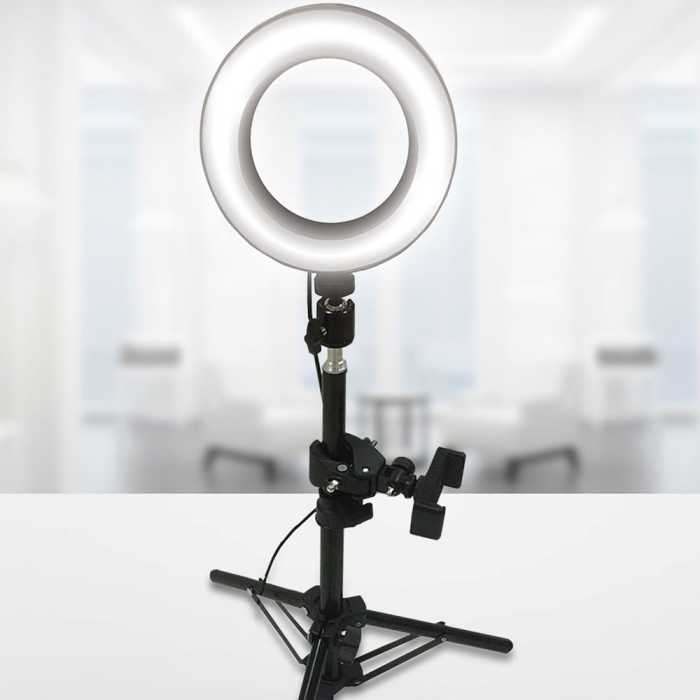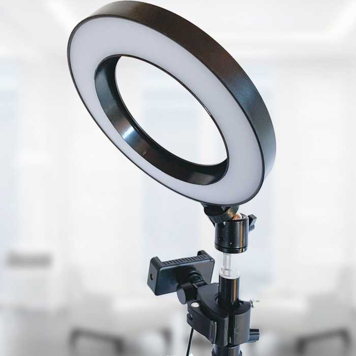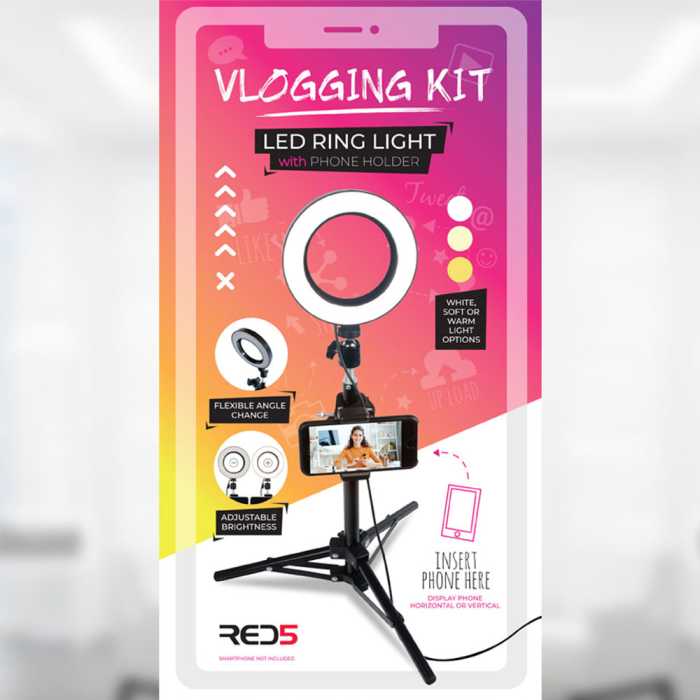 Start vlogging or streaming with this handy lighting kit! It includes an LED ring light with a tripod and built-in phone holder, which allows for vertical or horizontal display. The light has adjustable brightness and colour temperature, letting you choose between white, soft, and warm light.
