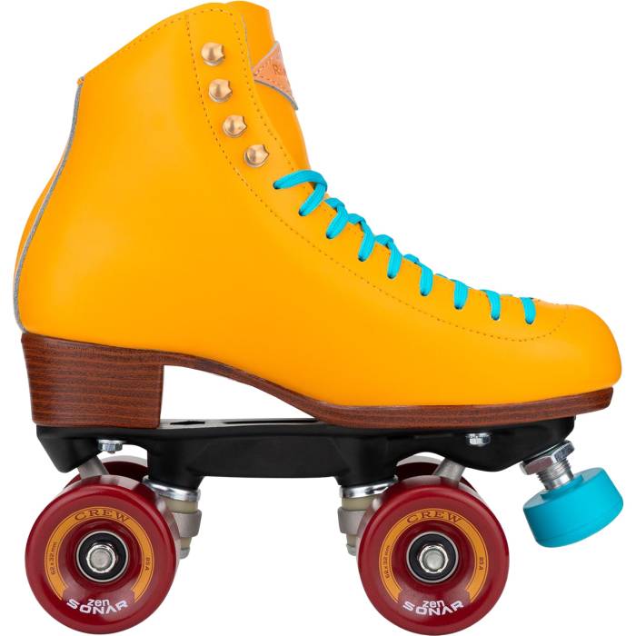 To create the Crew Skates, Riedell started with their durable and classic 120 boot as a base and then added some colourful contemporary flair and sophisticated touches. The Crew Skates are available in 3 unique colourways; Crimson, Ocean, and Turmeric, and they all feature colourful contrasting accessories. The comfortable high top boot rides on the Thrust Nylon plate and is finished with Sonar Zen 62mm outdoor wheels for a smooth ride, ABEC-5 bearings, and colourful adjustable toe stops.