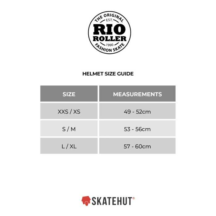 XXS/XS = 49-52cm S/M = 53-56cm L/XL = 57-59cm Introducing the Rio Roller Script helmet! Equipped with spare part padding to provide the perfect fit, and finished in a smooth matt coating, this helmet is the perfect addition to your Rio Roller range to offer the complete retro look.