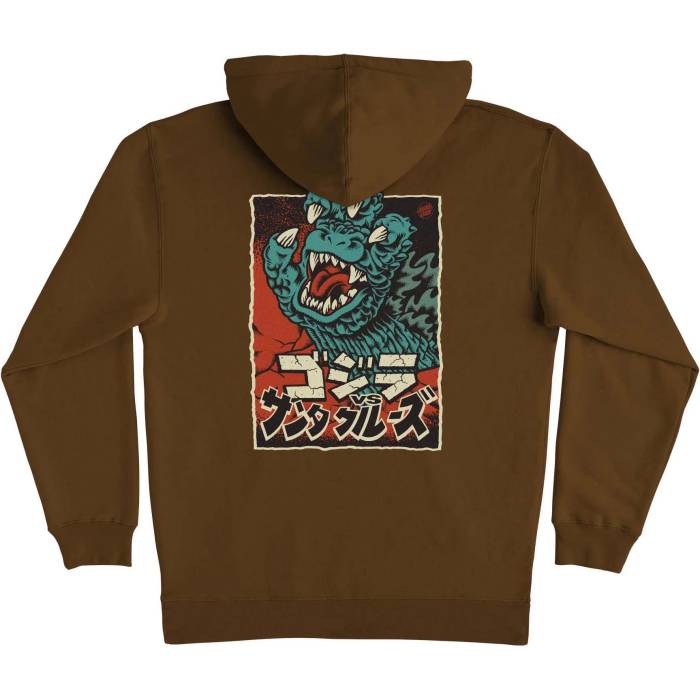 The Santa Cruz Godzilla Screaming Hand men's regular fit heavyweight fleece hooded pullover sweatshirt features small front and large back Godzilla Screaming Hand artwork printed in soft hand ink.