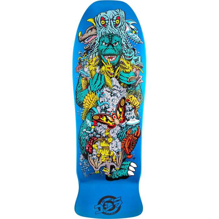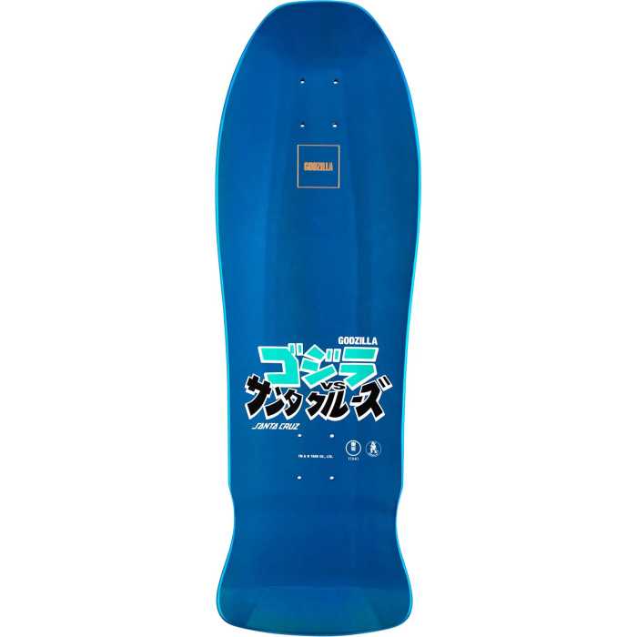 Santa Cruz Skateboards Godzilla Kaiju Roskopp deck featuring spot gloss on full dip candy metallic blue deck with Godzilla vs. Santa Cruz deck top graphics and laser engraved Godzilla logo.