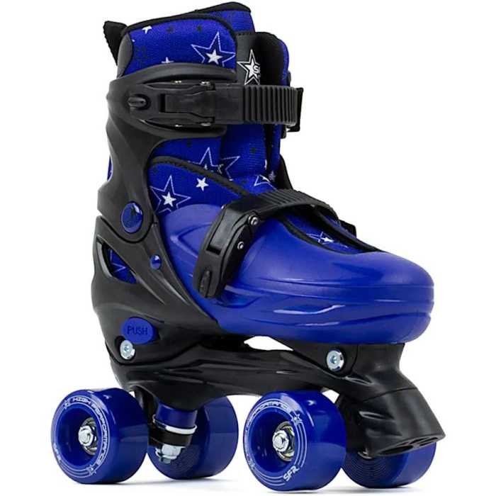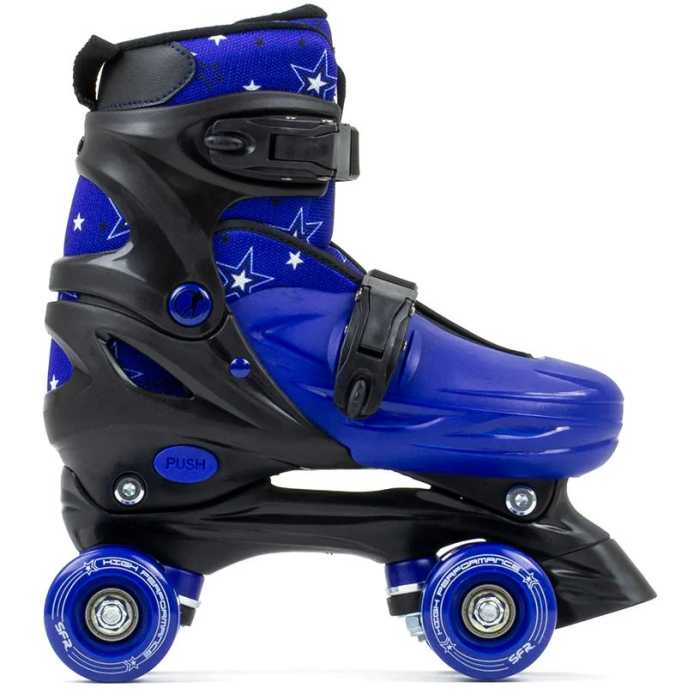 Small: Juniour UK 11 - UK 1 Medium: UK 1 - UK 4 The SFR Nebula, available in 4 colours, is a recreational adjustable quad skate which is perfect for the beginner skaters. Its design is bright and universal with a repeat pattern of stars.