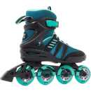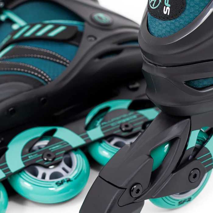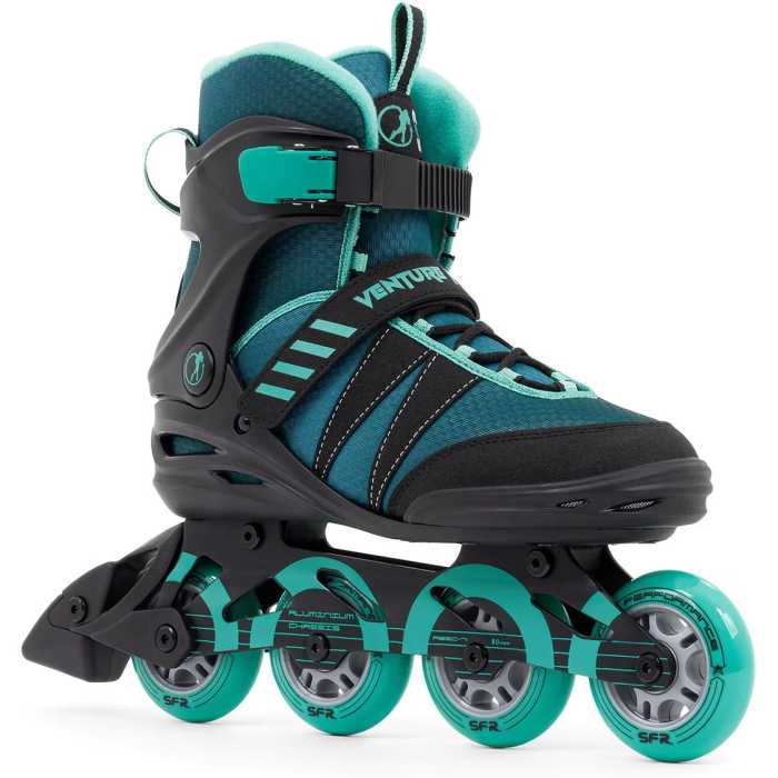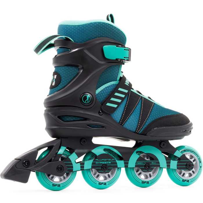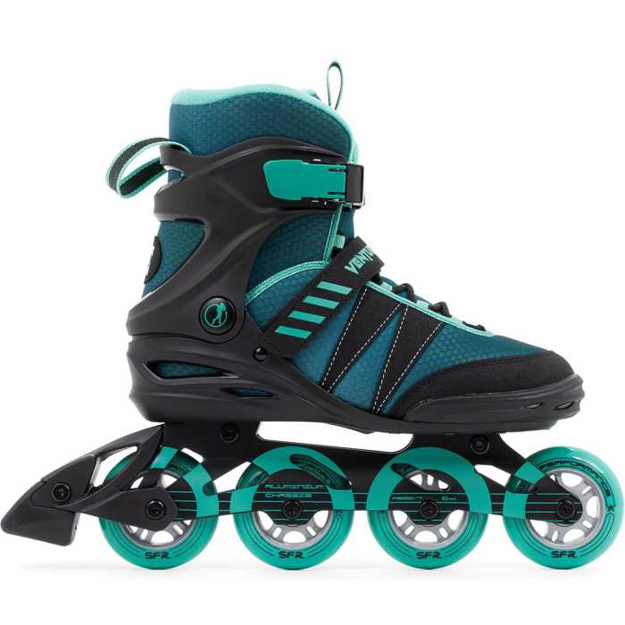 The SFR Venture Pro is designed with a comfortable, wide-fitting liner and insoles that promote a neutral foot position, helping to avoid cramped toes. Its unisex design provides a flexible fit for various users. The skate features a robust PP cuff and shell construction, a toe protector, and a reliable high-quality buckle combined with a 45-degree hook and loop power strap. The two-piece aluminium frame supports high-rebound urethane wheels, available in 80mm for sizes UK3-UK7 and 84mm for sizes UK8-UK11. It is equipped with ABEC-7 bearings and a TPR brake on the right foot. The maximum rider weight is 100kg.
