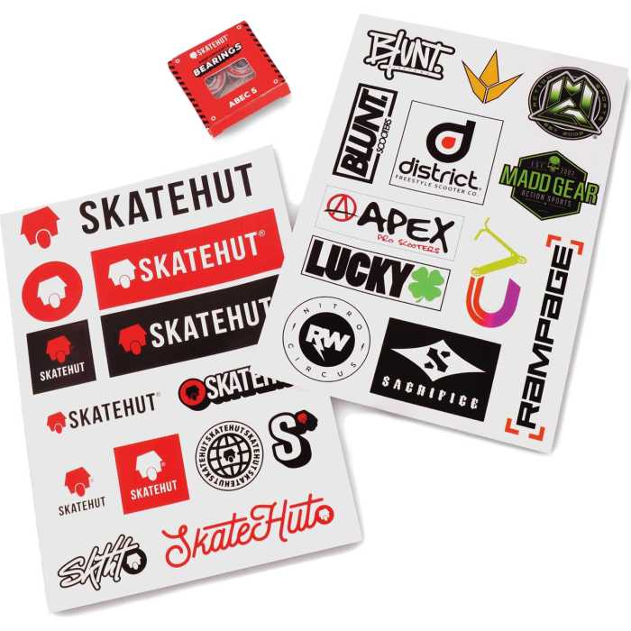 - 2 x Sticker Sheets: Two A5 sticker sheets featuring over 20 high quality stickers from your favourite scooter brands including SkateHut.