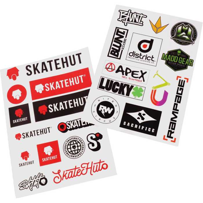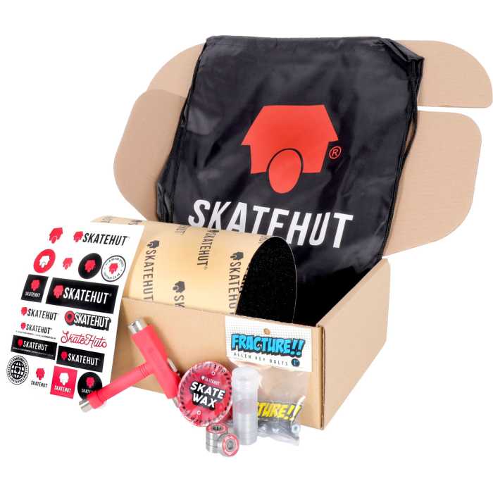 Inside you'll find skateboard wax, wheel bearings, skateboard griptape, sticker sheets, gym sack, skateboard tool and truck bolts.