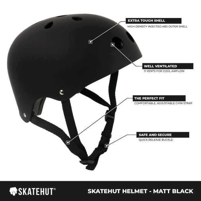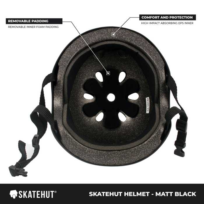The SkateHut Helmet now comes in a wider range sizes as well as a selection of colours with a matt finish. Fitted as standard with removable foam inserts for a perfect fit. The 11 ventilation holes provide great air flow to keep the user cool and comfortable while offering the necessary protection. The SkateHut Certified to EN1078 standards and can be used for a range of action sports including Cycling, Skating and Scootering.