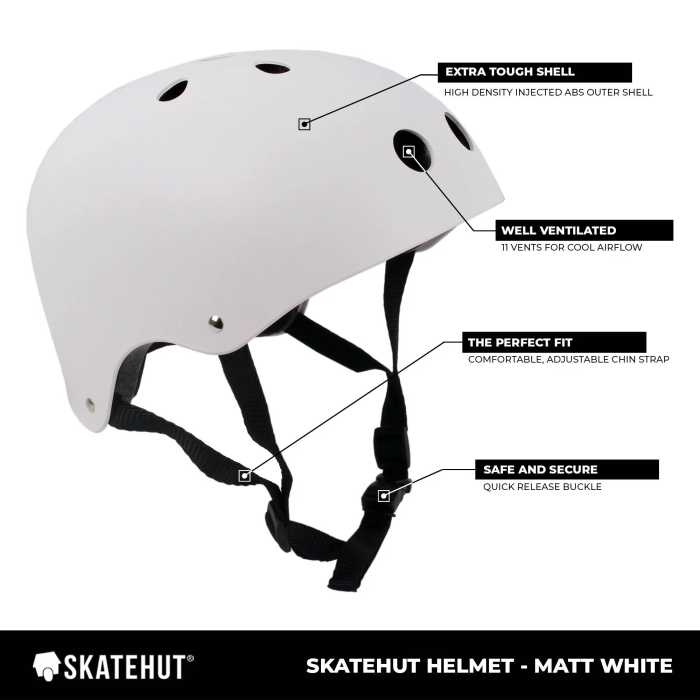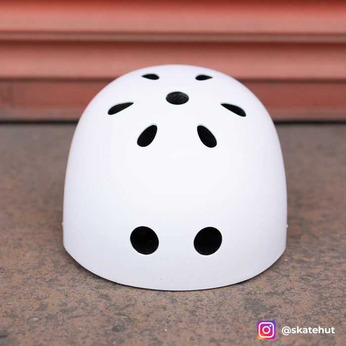 The SkateHut Helmet now comes in a wider range sizes as well as a selection of colours with a matt finish. Fitted as standard with removable foam inserts for a perfect fit. The 11 ventilation holes provide great air flow to keep the user cool and comfortable while offering the neccessary protection. The SkateHut Certified to EN1078 standards and can be used for a range of action sports including Cycling, Skating and Scootering.