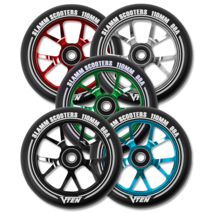 The Slamm V-Ten 110mm features a 10-spoke alloy core wheel which is made from anodised and heat-treated aluminium for strength and durability making it the perfect lightweight, strong component for any stunt scooter.
