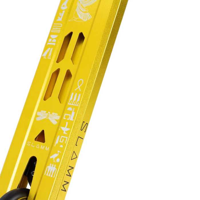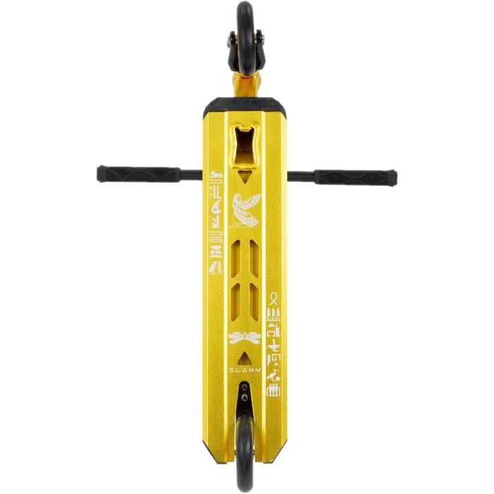Slamm’s Sentinel V4 takes inspiration from ancient Egypt with its stunning laser etched hieroglyphics on an anodised deck with unique CNC cut outs made as part of the graphics. CNC cut double bolt clamp and a forged head threadless aluminium fork are high precision parts for performance riding. Fitted with a Chromoly Steel Riser T-Bar, 165mm Team grips and impact resistant bar ends and deck blocks, this is a scooter designed to perform.