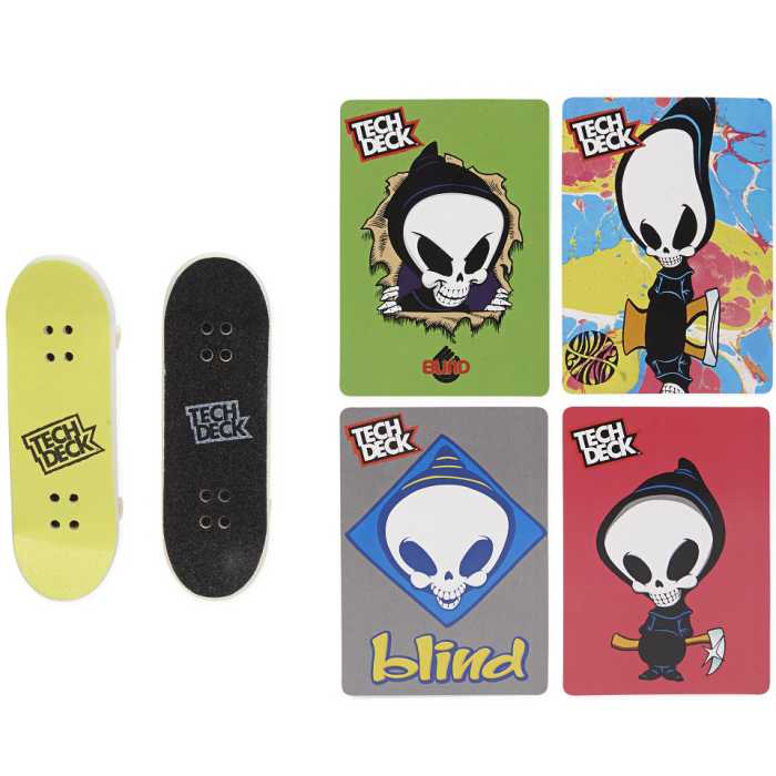 - Two Fingerboards and Trick Cards: Battle your friends with the two Blind Skateboards fingerboards and Tricks Cards. Draw a card and whoever can complete the trick on their turn wins