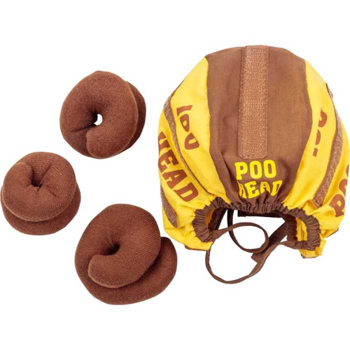 The set comes with a head cap equipped with sticky strips, as well as three soft poops that adhere to these strips.