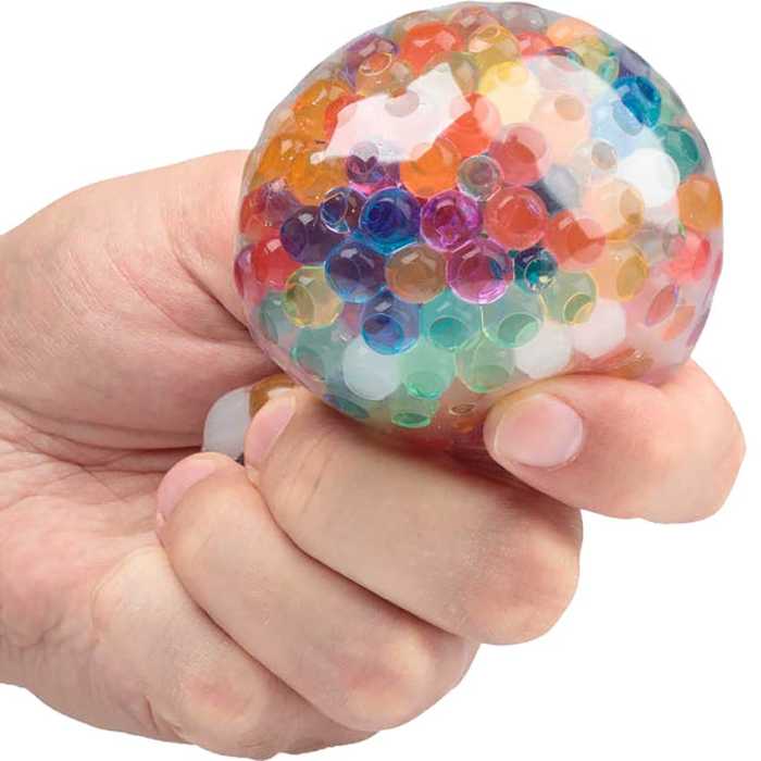 Soft and squidgy ball filled with hundreds of colourful jelly-like orbs.