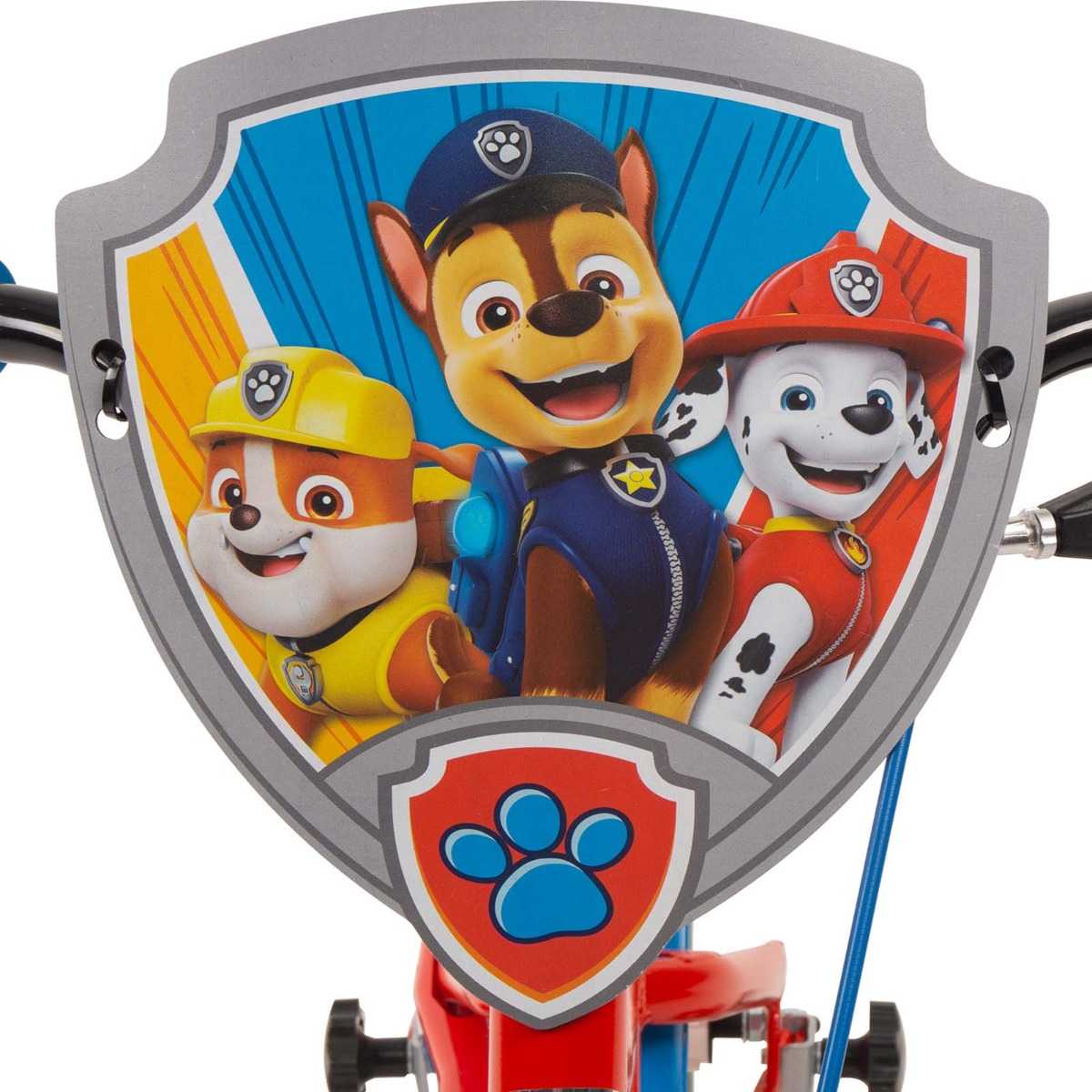 Decked out in PAW Patrol colours with themed frame, PAW Patrol handlebar Shield, chainguard, stabiliser detail, and themed decals.