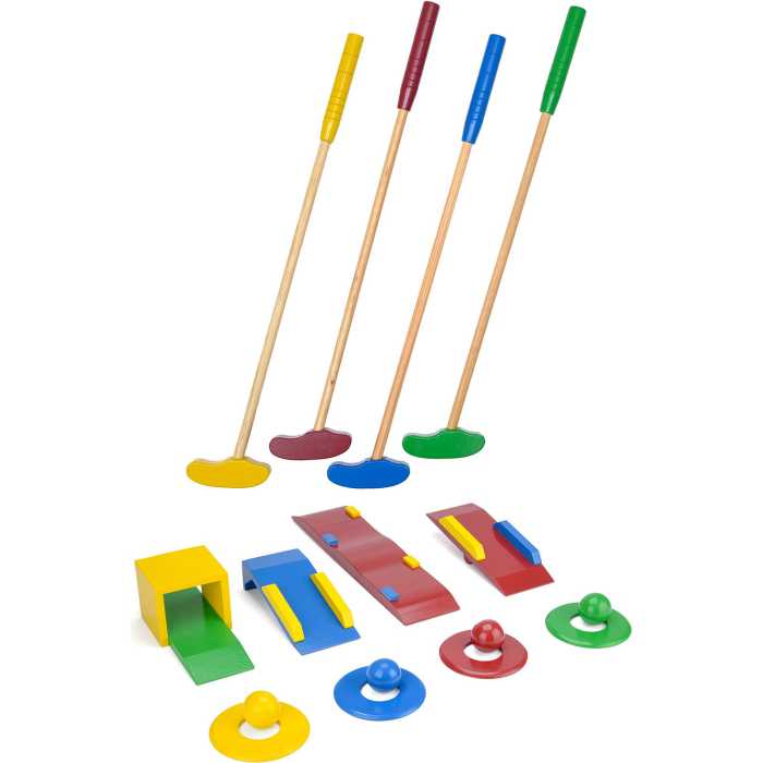 - Includes: 4 High Quality Wooden Putters, 4 Wooden Golf Balls, 4 Obstacles & 4 Holes