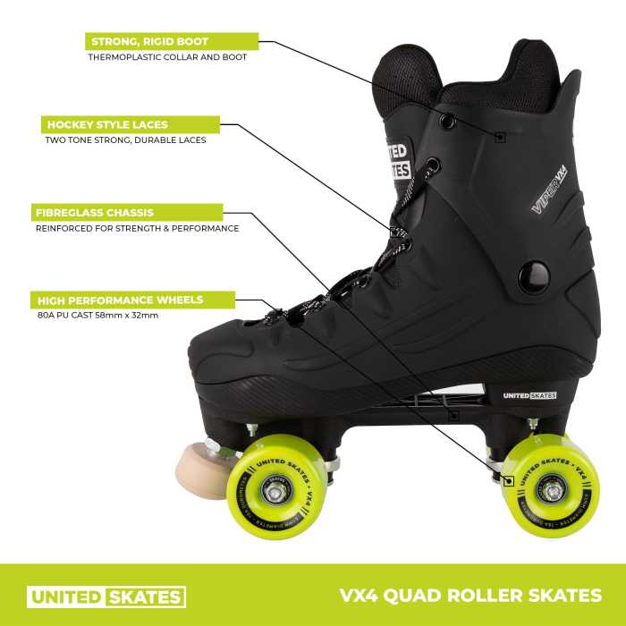 The United Skates VX4 Elite Quad Skates feature an updated look and build, with a retro feel.