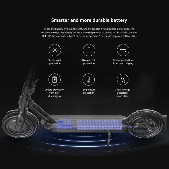 When the battery level is under 30% and the scooter is not powered on for about 10 consecutive days, the battery will enter into sleep mode* to extend its life. In addition, the BMS 5th Generation Intelligent Battery Management System will keep your battery safe.