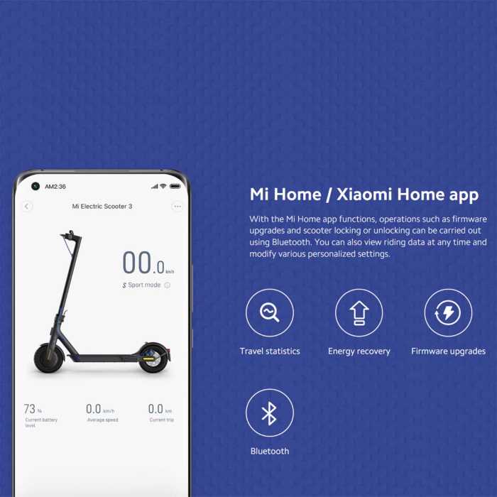 With the Mi Home app functions, operations such as firmware upgrades and scooter locking or unlocking can be carried out using Bluetooth. You can also view riding data at any time and modify various personalized settings.