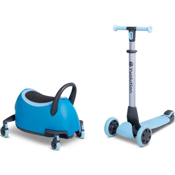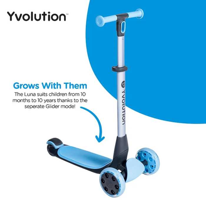 The Y-Volution Y Glider Luna is a 5-in-1 ride-on to scooter with storage trunk that grows with your child from 10 months to 10 years. Our tool-less design allows you to convert easily between 5 modes.