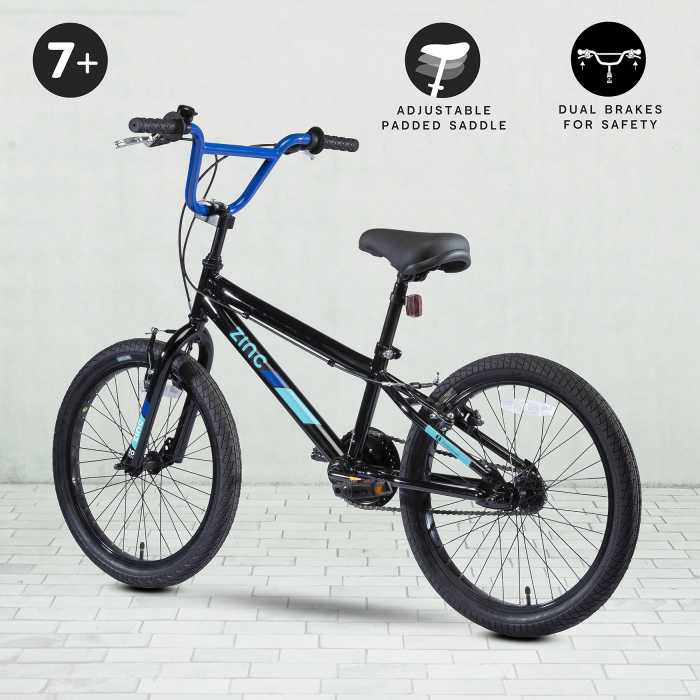 Ride in style at the skatepark or in the street with the new Zinc 20” Switch BMX! Designed with a cool black and blue design you will always stand out from the rest. Designed for ages 7+, the fork, frame and handlebar are made from a strong, high quality ERW steel for extra durability whilst you are riding. Equipped with reliable front and rear V-brakes so that you can easily control your Switch BMX and safely come to a stop. For extra safety, the scorpion comes with front, rear and pedal reflectors to ensure that you are always visible as well as a warning bell. For your convenience the Switch comes 85% preassembled!